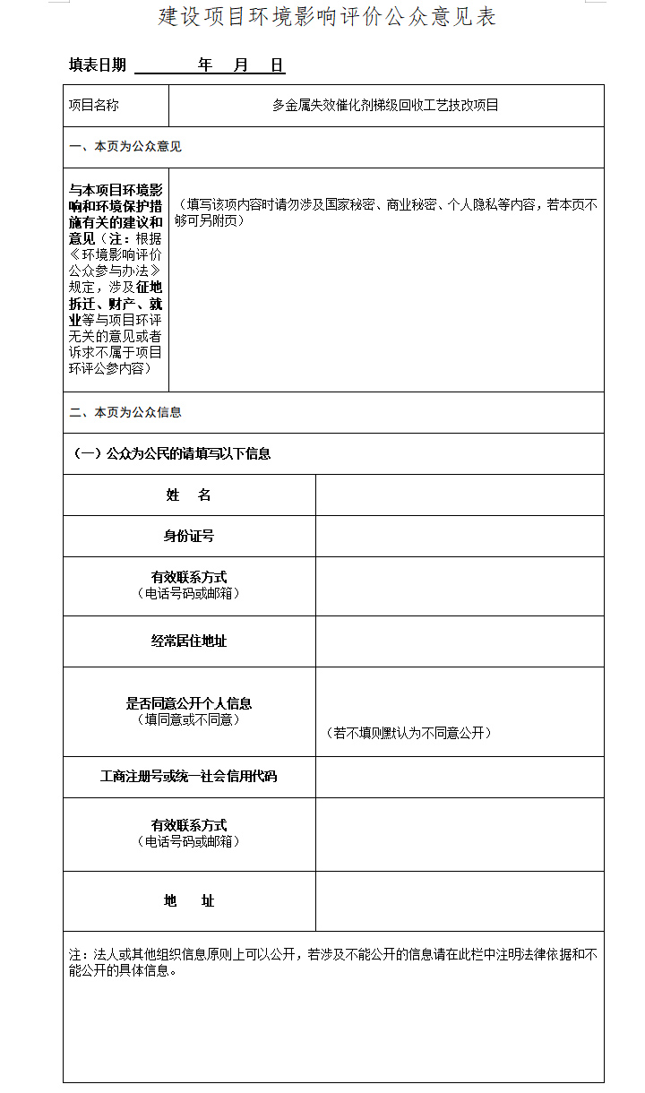 多金属失效催化剂梯级回收工艺技改项目 环境影响评价第一次公示